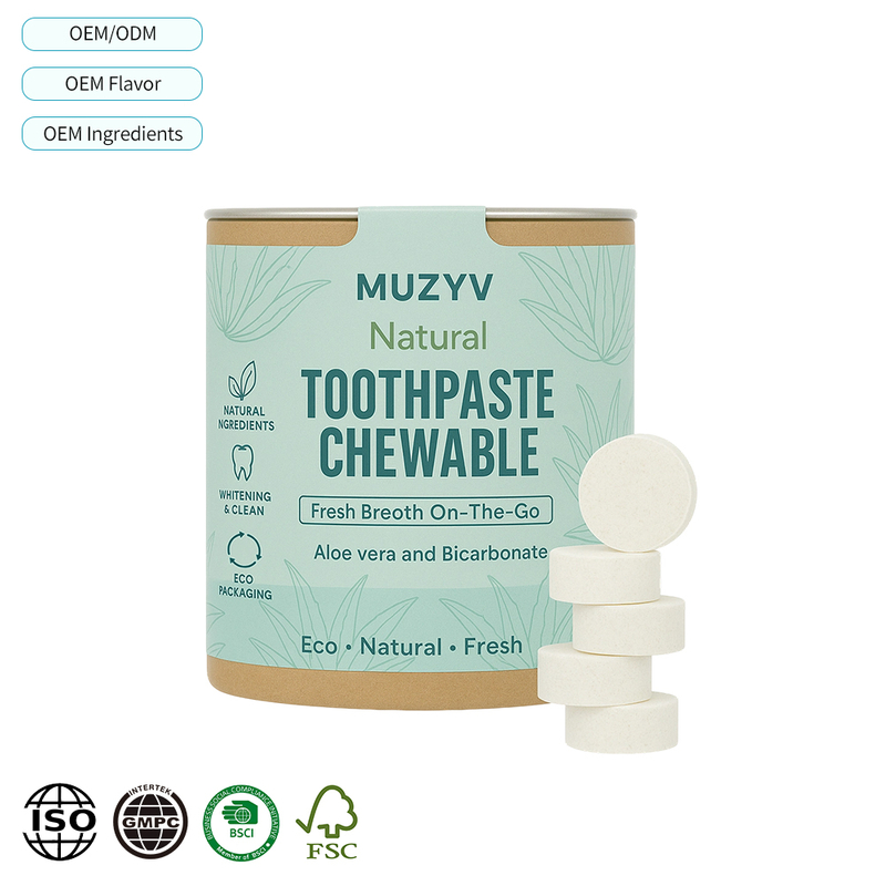 These aloe vera toothpaste tablets offer a soothing and refreshing approach to daily brushing. The waterless toothpaste tablets format supports sustainable packaging, travel convenience, and refill systems. OEM and ODM customization is available for flavor development, fluoride or fluoride free options, and hydroxyapatite toothpaste tablets formulations.
